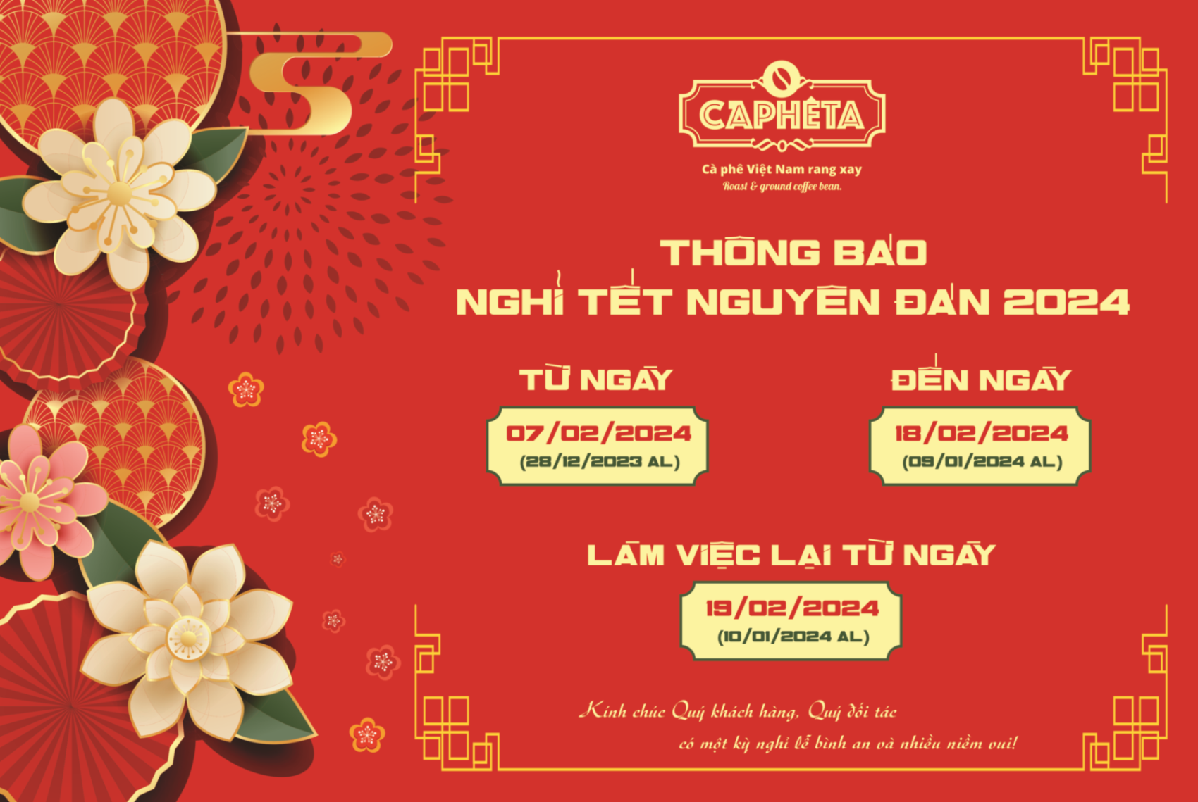 Bây giờ, CAPHETA xin phép được nghỉ Tết Nguyên Đán và xin hẹn trở lại với công việc vào ngày mùng 10 Âm lịch của Tháng Giêng 2024.