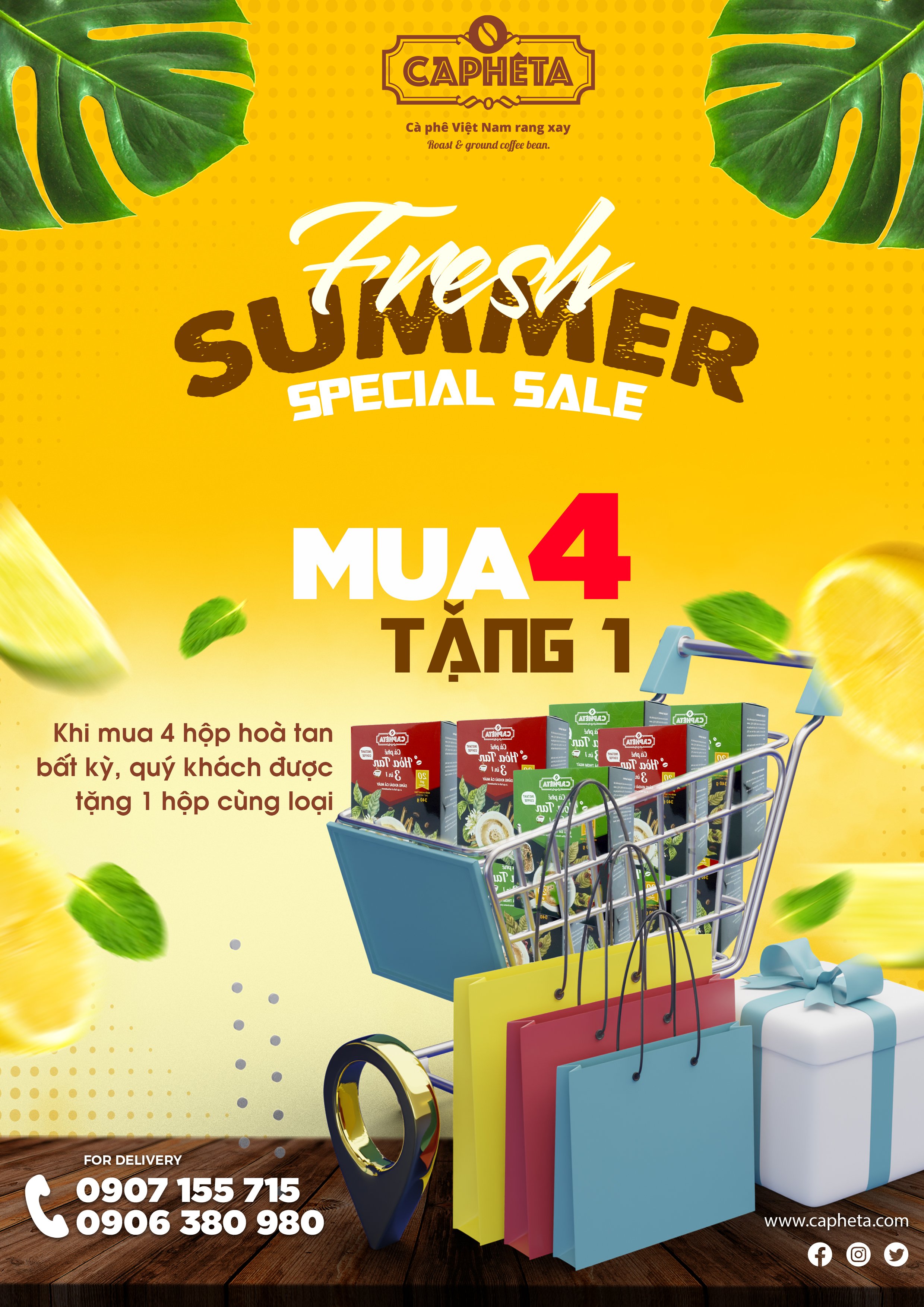 Capheta kính gửi Quý khách chương trình khuyến mãi MUA 4 TẶNG 1 - áp dụng với sản phẩm cà phê hòa tan 3 in 1. Khuyến mãi chưa bao gồm phí ship.